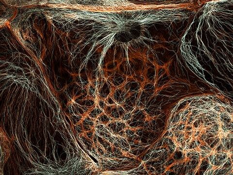 Lindamood Halli — Актиновый цитоскелет (циан) и эндоплазматический ретикулум (красный) клетки рака мозга у мыши.