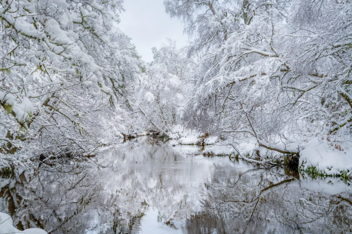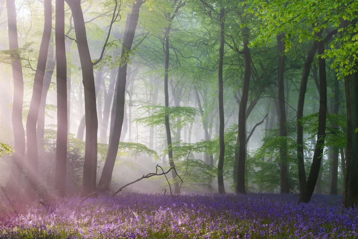 На четырех снимках, сделанных в британских лесах в разные моменты года, смена сезонов раскрывается в атмосферной красоте: мягкие солнечные лучи освещают колокольчики в весеннем тумане, насыщенная зелень лета мерцает под туманными кронами, осень окрашивает листья бука в золотые оттенки, а зимой речной пейзаж превращается в спокойную морозную сцену.