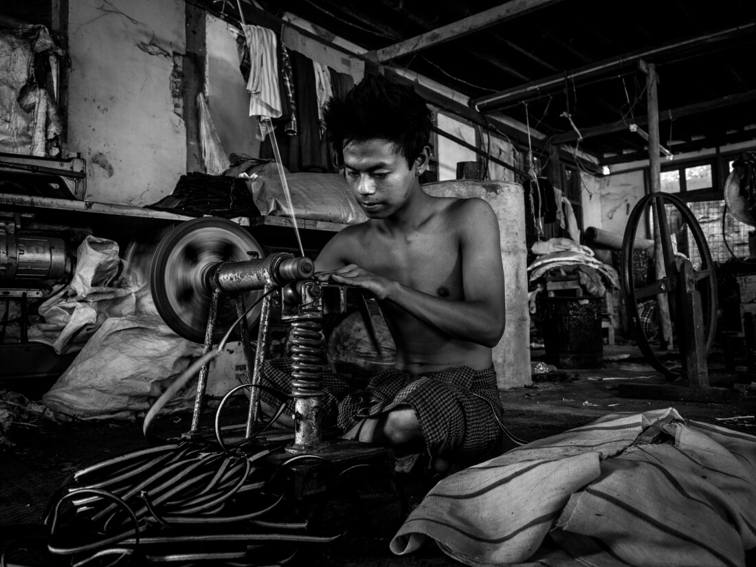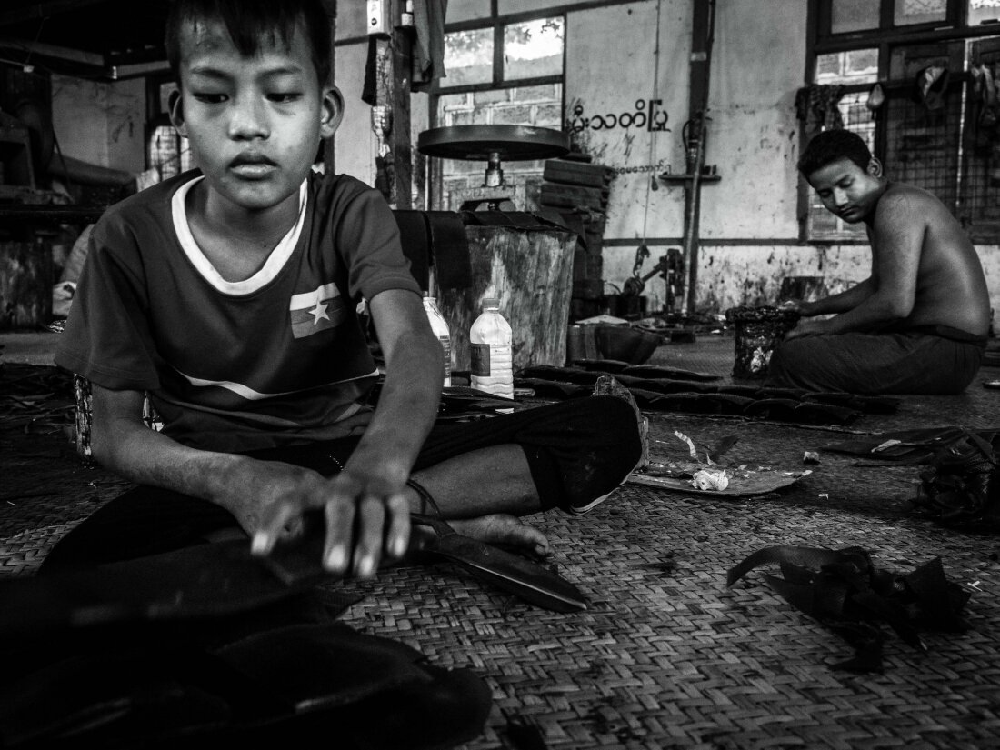 Запах клея чувствуется задолго до входа внутрь. Снаружи ослепительный свет, внутри тени, только что прорезанные каким-то лезвием света. В воздухе тишина, смешанный запах химии и резиновых смесей. Молодые руки и босые ноги. Работа, которую нужно делать с закрытыми глазами, не думая. Взрослые маневрируют машинами, другие вырастают без лучшего будущего. Готовая продукция покидает лабораторию для подготовки к отправке пожилыми женщинами.