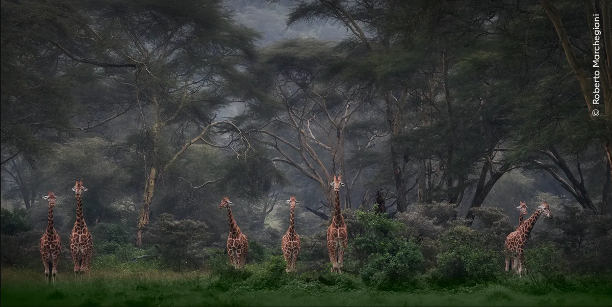 Роберто Маркеджани (Roberto Marchegiani) «наблюдает, как группа жирафов Баринго попадает в дождливую погоду».