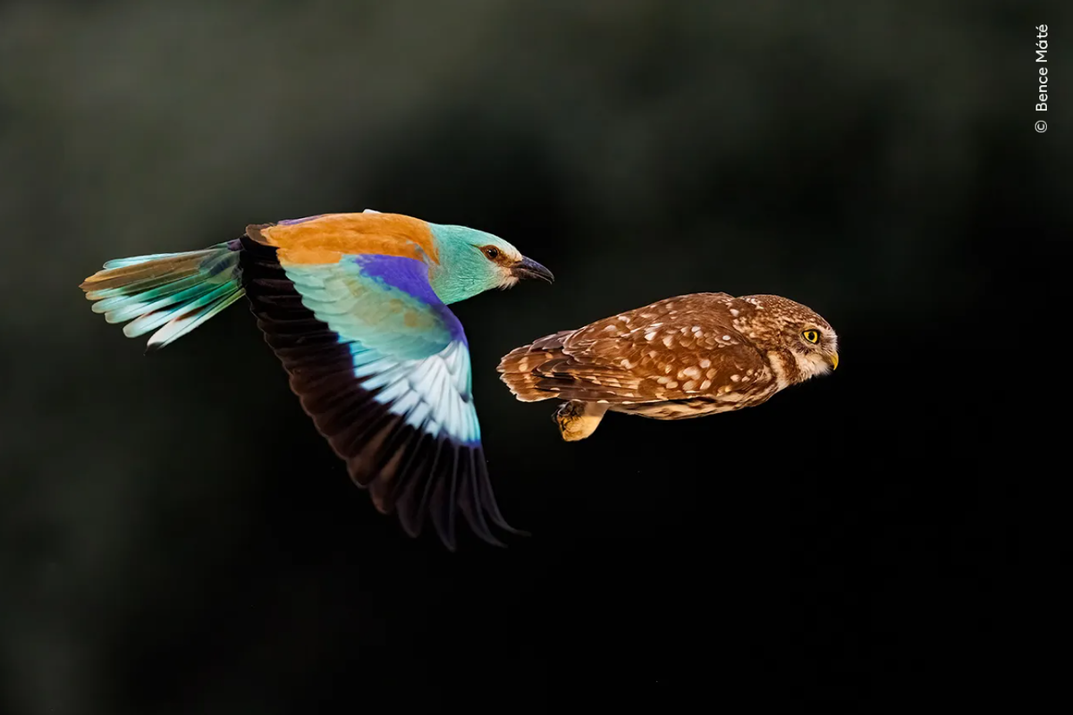 Бенце Мате (Bence Máté) «наблюдает, как европейский сизоворонка и домовый сыч гоняются друг за другом в подлеске. Чтобы „заморозить“ действие, Бенце установил две камеры рядом на штативе. Каждая камера была синхронизирована на 20 кадров в секунду, а затворы спускались с помощью дистанционного управления. После 27 дней в укрытии он запечатлел эту сцену».