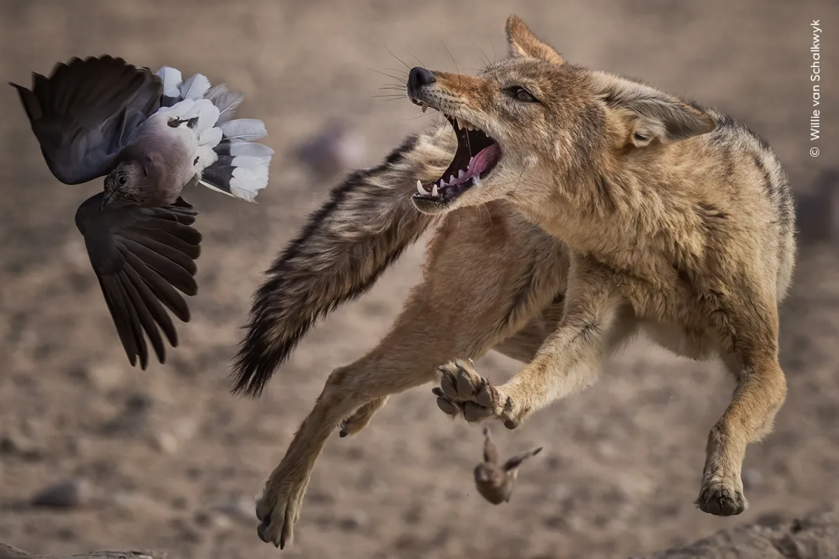 Вилли ван Схалквик (Willie van Schalkwyk) «становится свидетелем опасного сближения между жаждущей голубкой и оппортунистическим шакалом у водопоя в Южной Африке. Казалось, шакалы игнорировали капских горлиц, но они выжидали. Как только птицы убаюкивались ложным чувством безопасности, шакалы бросались в стаю, пытаясь выхватить одну наугад».