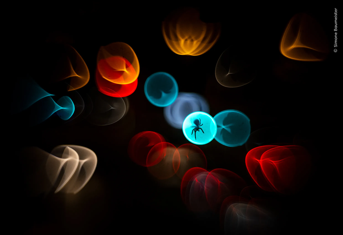 Симоне Баумайстер (Simone Baumeister) показывает паука-кругопряда на его паутине на пешеходном мосту, силуэт которого виден благодаря огням проезжающих внизу автомобилей".