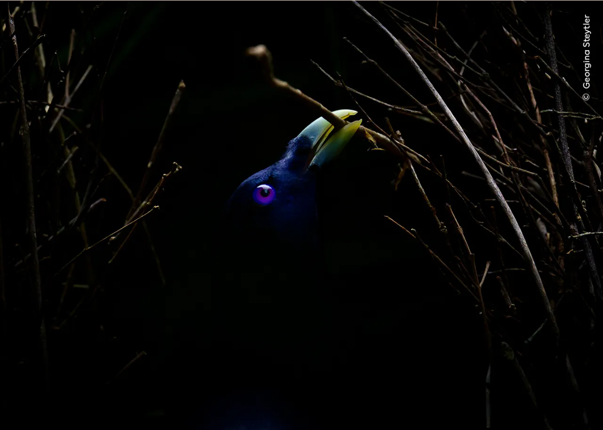 Джорджина Стейтлер (Georgina Steytler) «использует длиннофокусный объектив, чтобы запечатлеть шалашника с сиренево-голубыми глазами, который возвращает прутик в свой шалаш».