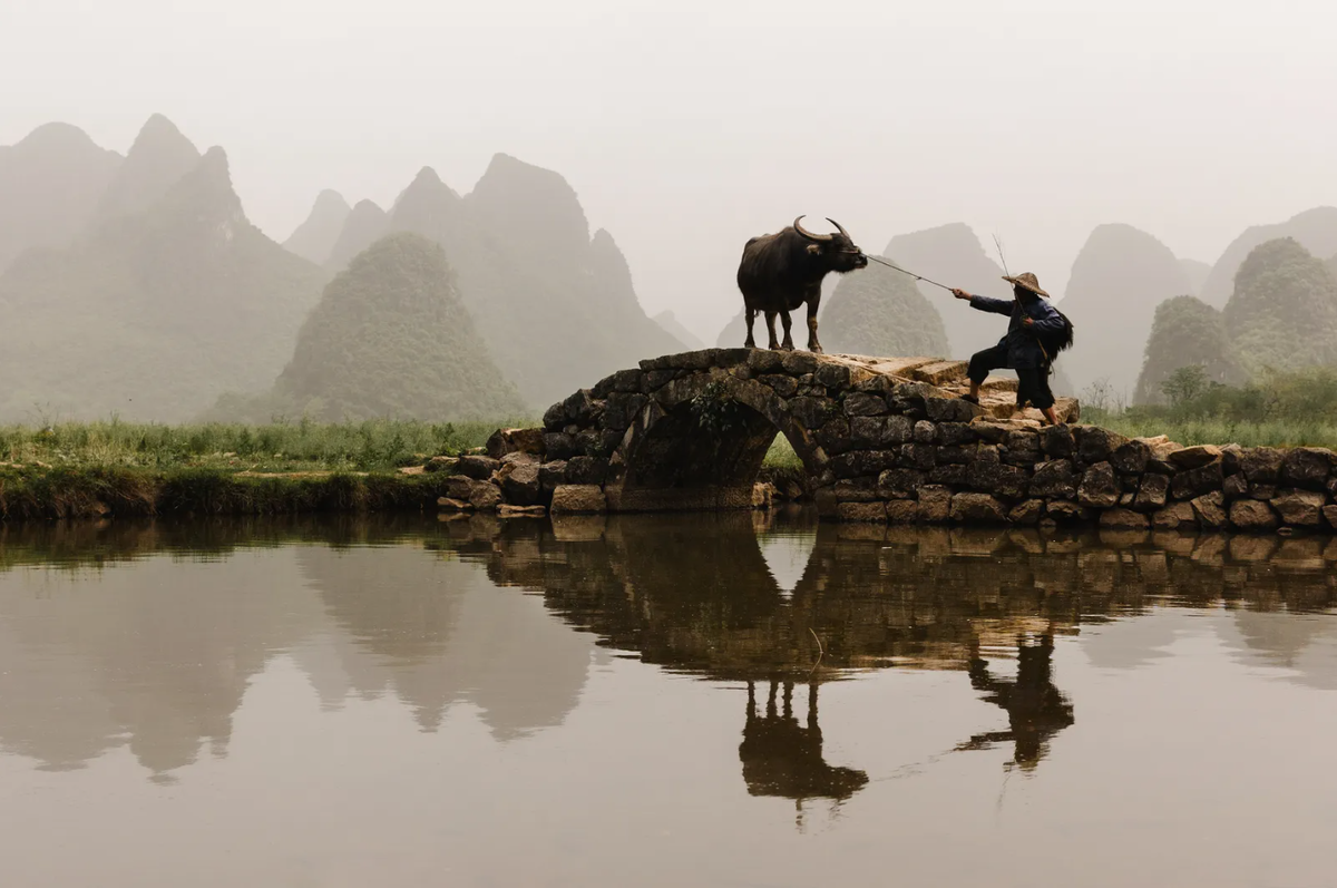 «Этот снимок я сделала во время противостояния традиционного китайского фермера и его водяного буйвола. Их расположение на мосту позволило поймать не только их, но и отражение известняковых гор позади».