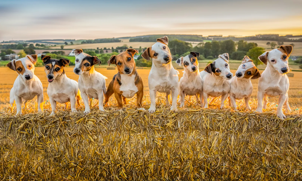 «В конце жаркого солнечного дня Дэнни Кэссиди, владелец Dead Cert Pest Control, устроил своим джек-расселам немного веселья на стогах соломы. Эти собаки помогают ему очищать фермы от вредителей».