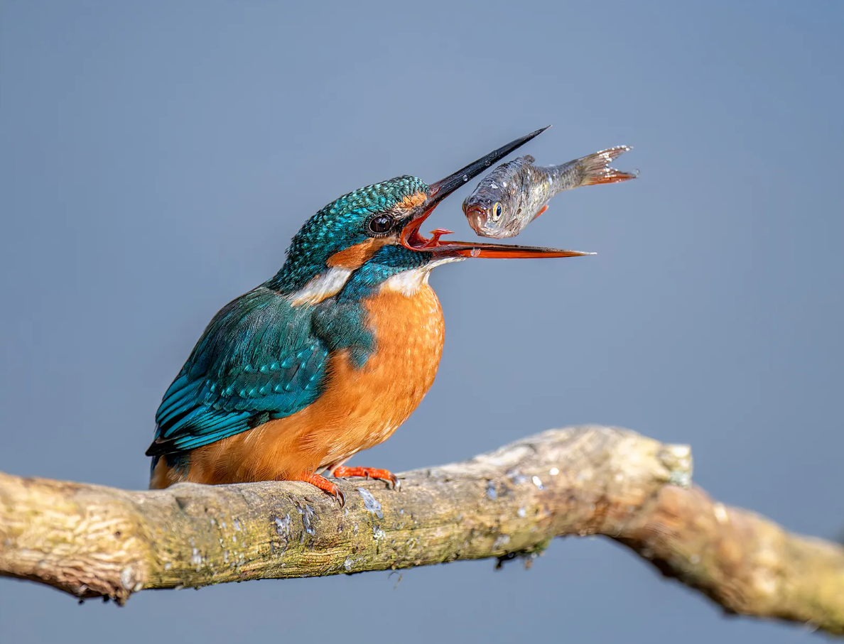 «Самка зимородка вот-вот проглотит бедную рыбку... Меня зацепил взгляд этой смирившейся рыбки, будто обращённый прямо к зрителю, и идеальная симметрия того, как она висит между клювами птицы».