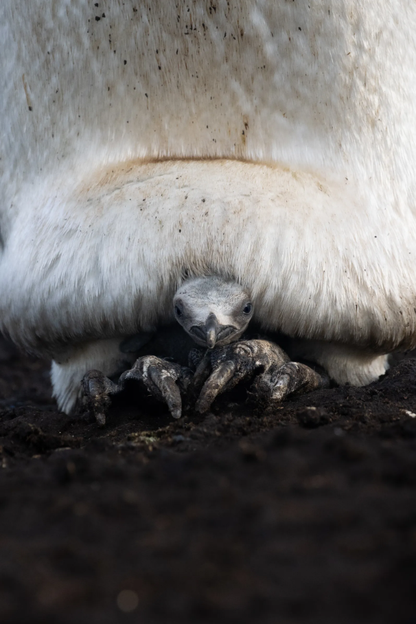 «В хаосе колонии королевских пингвинов взрослые птицы ухаживали за своими птенцами. Маленьких они полностью накрывают для защиты от хищников и непогоды, но иногда родитель выпрямляется — и появляется этот малыш, почти инопланетный, совсем не похожий на будущего короля. Я хотел передать редкую деталь — момент, когда птенец показан миру, но всё ещё под защитой родителя».
