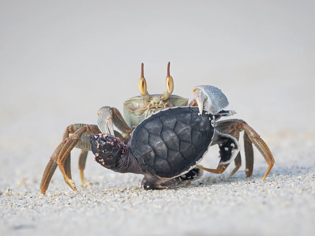«Я была с природоохранной командой на острове рано утром, отслеживала следы черепах и надеялась увидеть детёнышей, возвращающихся в море. Почти завершив круг по пляжу, я заметила краба-призрака, несущего что-то в клешнях. Это оказался погибший детёныш черепахи. Я легла на песок и почти час ловила момент, пока краб бегал туда-сюда. Из тысячи малышей до взрослого возраста доживает лишь один — остальные погибают от хищников ещё до моря».