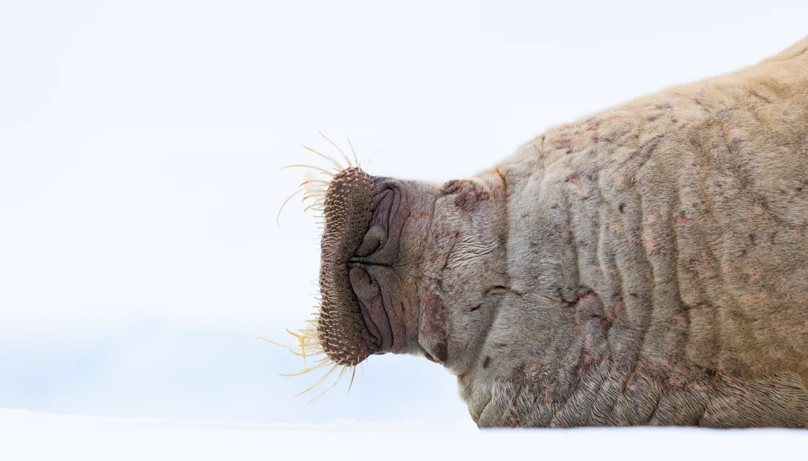 «Моржи в Шпицбергене отлично восстановили популяцию после введения охранного законодательства и теперь почти не боятся людей. Если вести себя корректно, можно наблюдать их без малейшего беспокойства. Этот крупный самец отдыхал на льдине, и только сзади открывался необычный ракурс: он лежал на боку, с закрытыми глазами, будто я смотрю сверху».