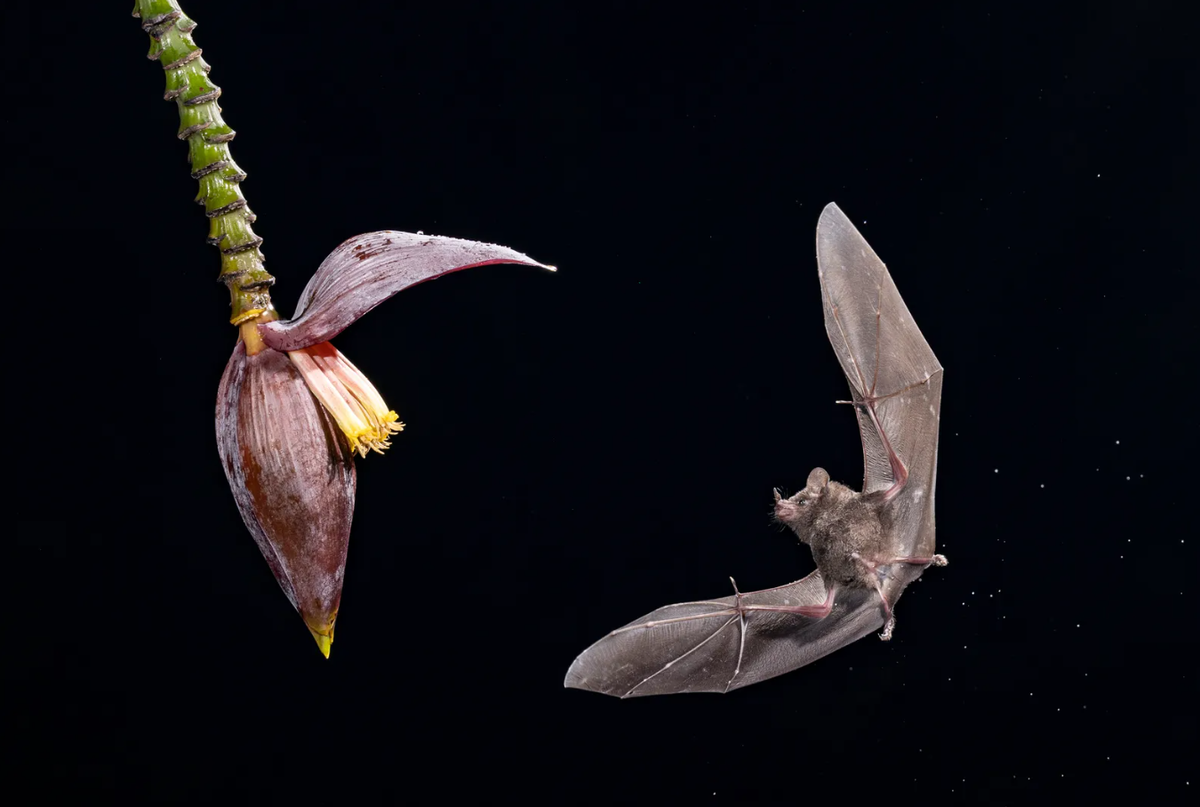 «Длинноязыкий бат (Glossophaga soricina) летит за нектаром, размещённым в цветке банана. Летучие мыши прерывали инфракрасный луч, который запускал вспышки, расставленные вокруг цветка. Мы снимали в полной темноте, и уже позже стало ясно, насколько много мышей кружило рядом».