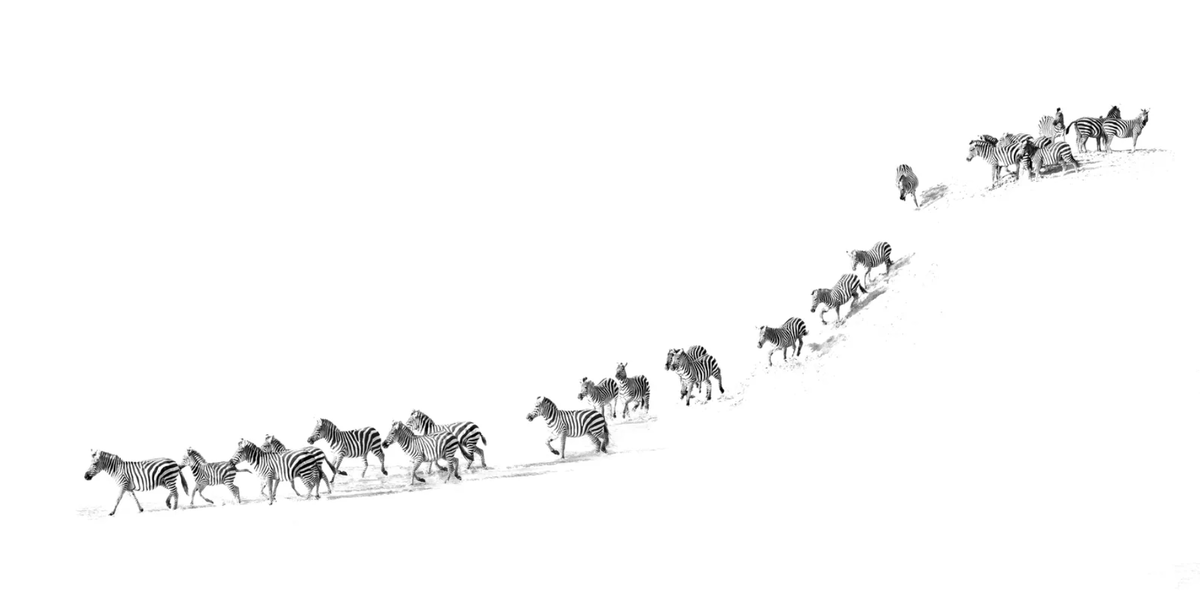 «Мы увидели большое стадо зебр на берегу реки Сэнд. Вода была мелкой, и я смог снять, как они медленно спускаются, а потом переходят реку почти бегом. Я решил сделать „high key“ изображение, чтобы подчеркнуть контрасты их полос и движение воды».