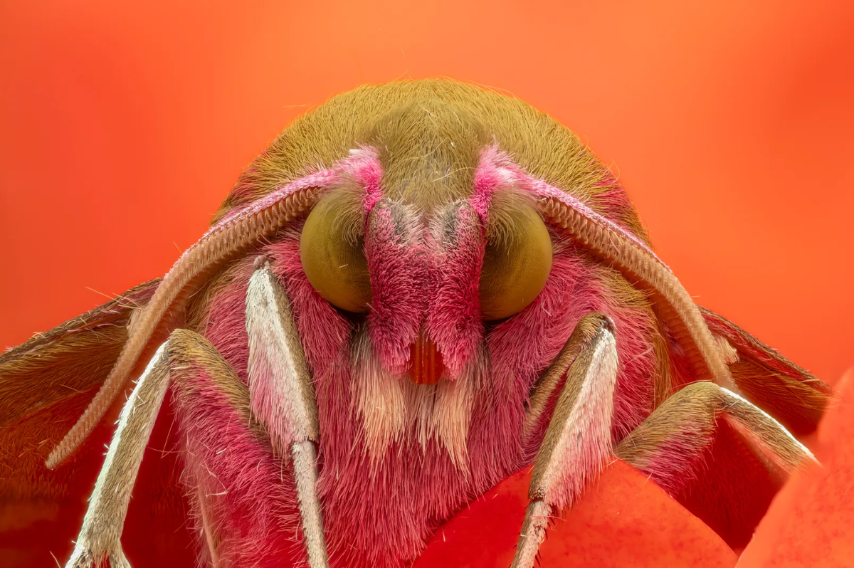 «Мне повезло наблюдать розового бражника-слоника в своём саду. Пока он отдыхал, я перенёс его на оранжевую розу, чтобы создать яркий фон, и сделал стэк из 82 кадров, чтобы передать мельчайшие детали».