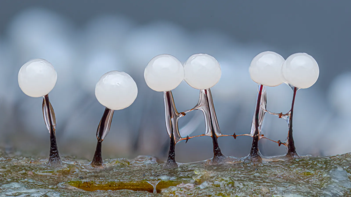 «Это группа молодых слизевиков Collaria arcyrionema. Я нашёл их в местном лесу — они росли на гниющих брёвнах берёзы. Если присмотреться, справа можно увидеть пару „целующихся фигурок“, а слева — двух одиночек. Это фокус-стек из 95 снимков, снятый со вспышкой и самодельным диффузором».