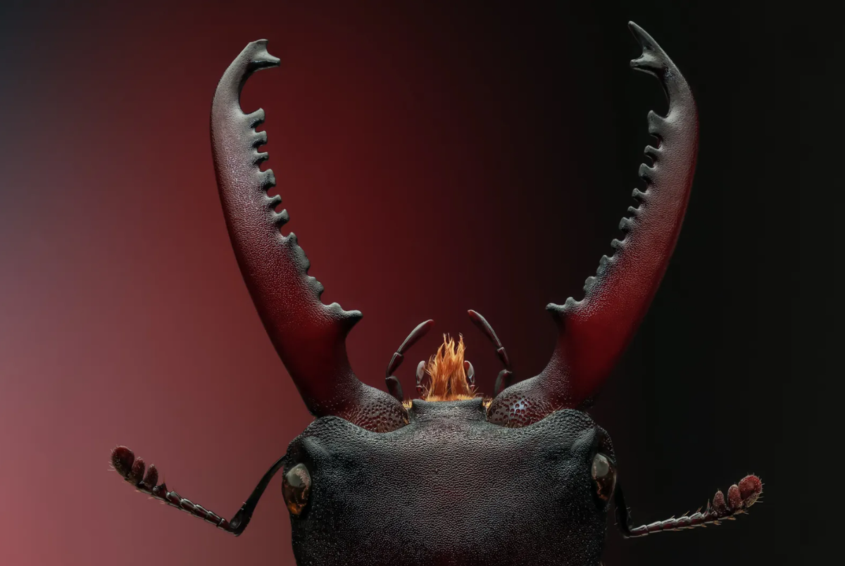 «Самцы жуков-оленей легко узнаются по огромным мощным мандибулам, которые они используют в борьбе и для привлечения самок. В некоторых регионах, включая Великобританию, европейский жук-олень — охраняемый вид. Это составной кадр из 89 снимков».
