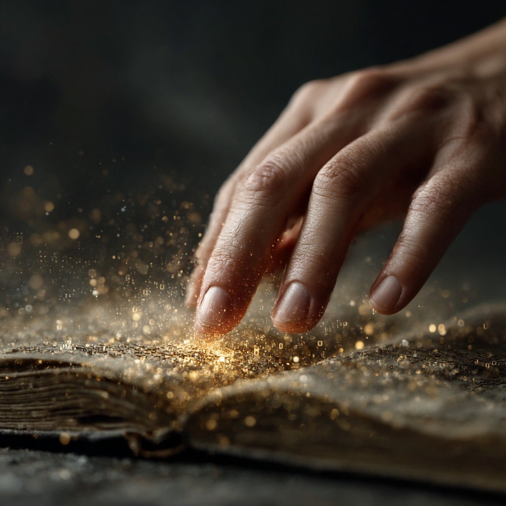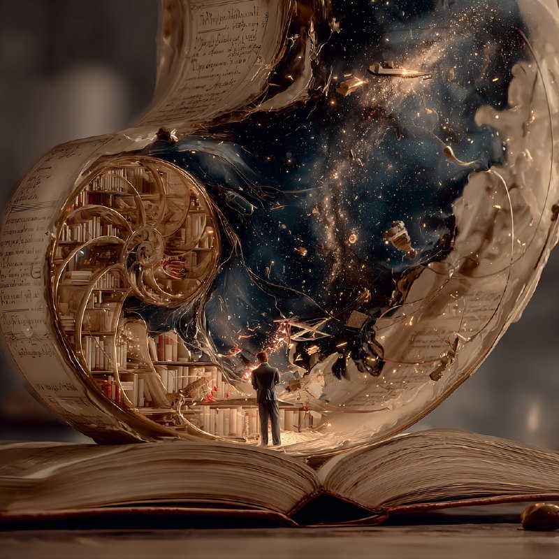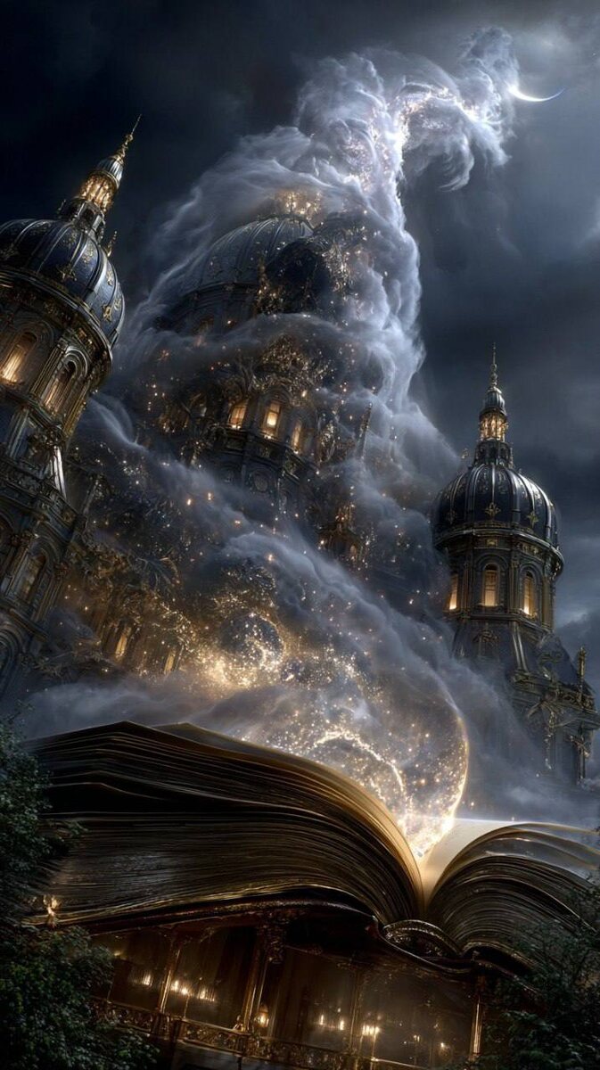 В одних работах огромные тома превращались в города из золота и туманных облаков — словно цивилизации, выросшие прямо из переплета. В других — страницы открывались, выпуская в воздух целые галактики. Были и камерные сюжеты: фигуры людей, застывшие под звездным куполом, читающие книгу, внутри которой живет вселенная.