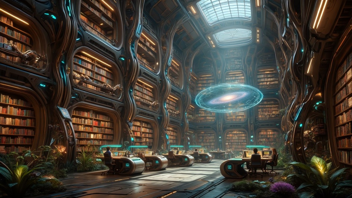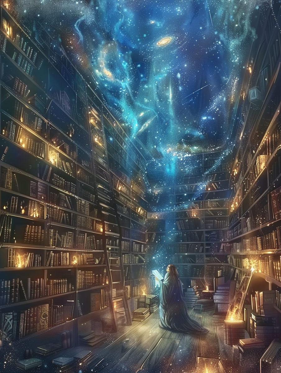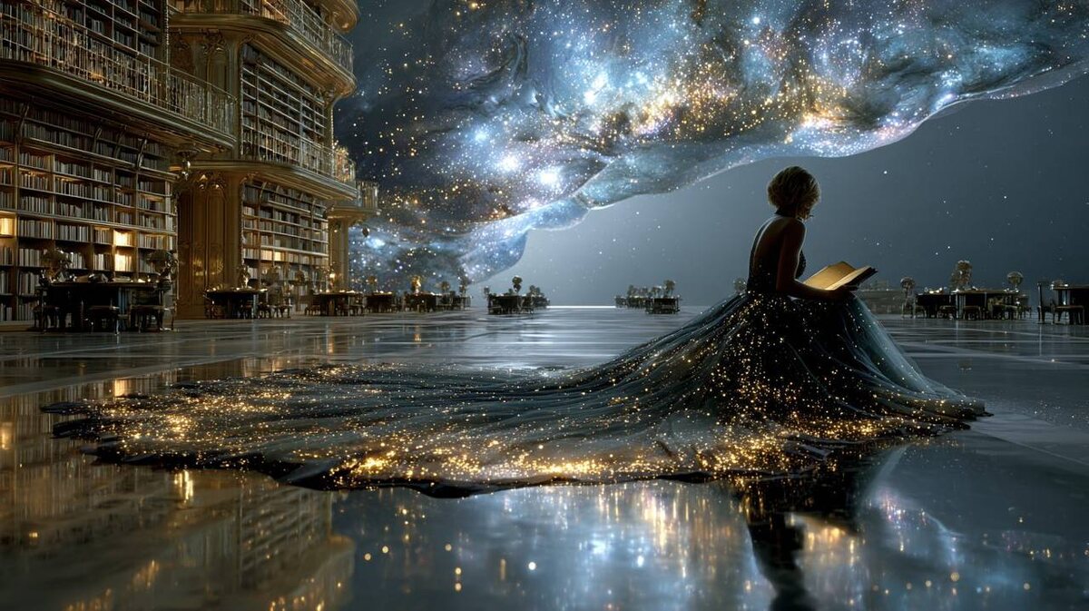 Представьте зал, где вместо пыли над страницами кружат звездные россыпи. Где обложки раскрываются, превращаясь в планеты. Где полки уходят куда-то за горизонт, рассыпаясь на бесконечные уровни света. Именно такие образы создавали участники — ученики Академии, многие из которых совсем недавно начинали путь в нейрофото.