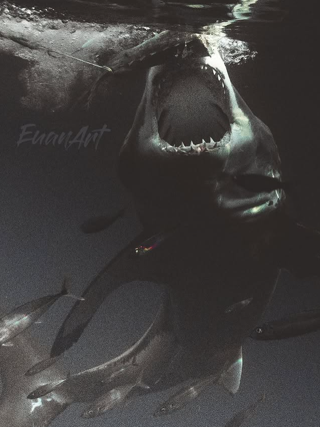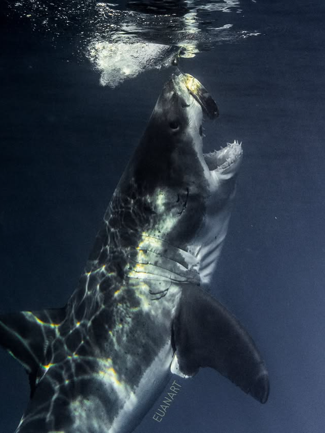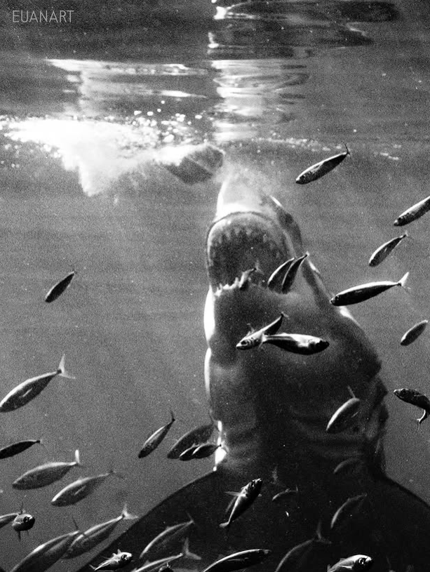 Один из его самых известных снимков — реальное воплощение культового плаката к фильму «Челюсти». Настоящая акула, снятая снизу, на фоне света, пронзающего толщу воды. Киношный кошмар превратился в живую красоту.