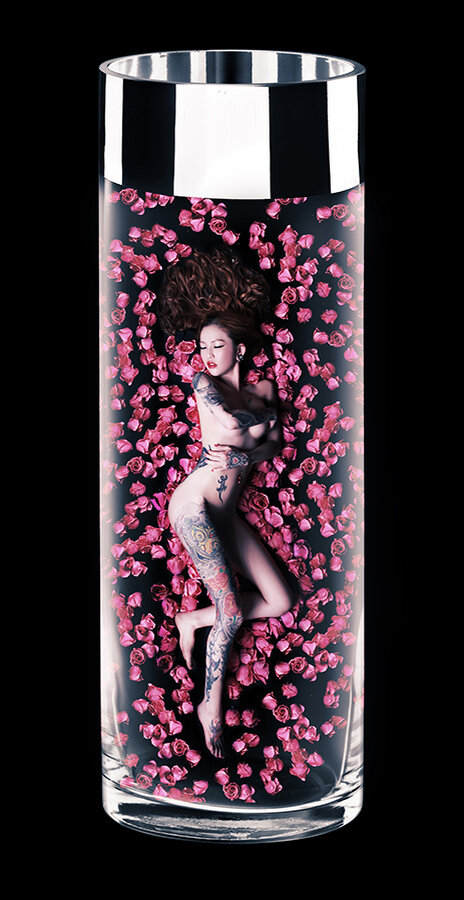На фото — знаменитый татуировщик в розах, которую на постобработке я поместил в бутылку. Чтобы передать настроение тишины, я попросил ее закрыть глаза.